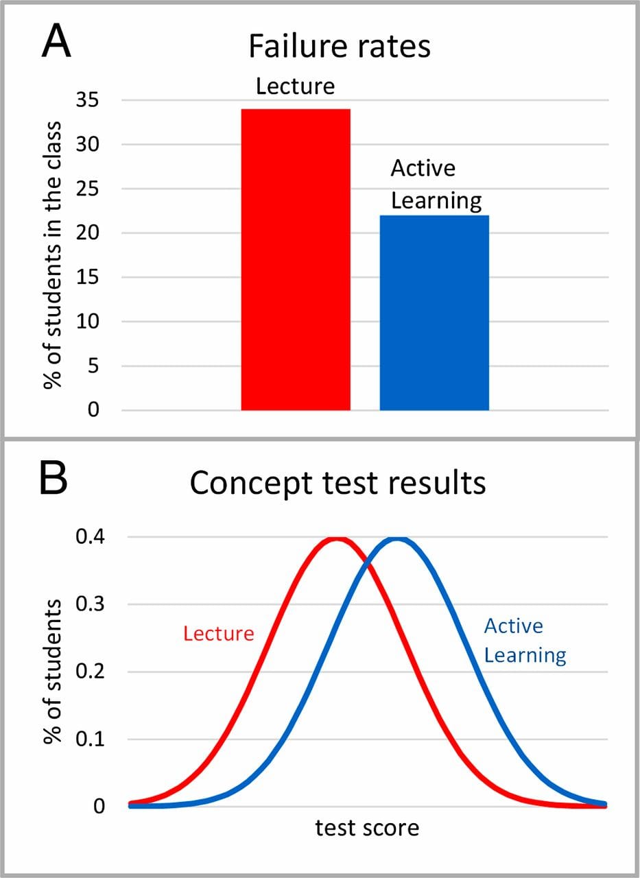 According to research by Freeman S, et al. when using active learning compared to traditional lecture students’ average failure rate decreased by 12% and performance on identical or comparable tests improved by nearly half of the standard deviation of the test scores (an effect size of 0.47).